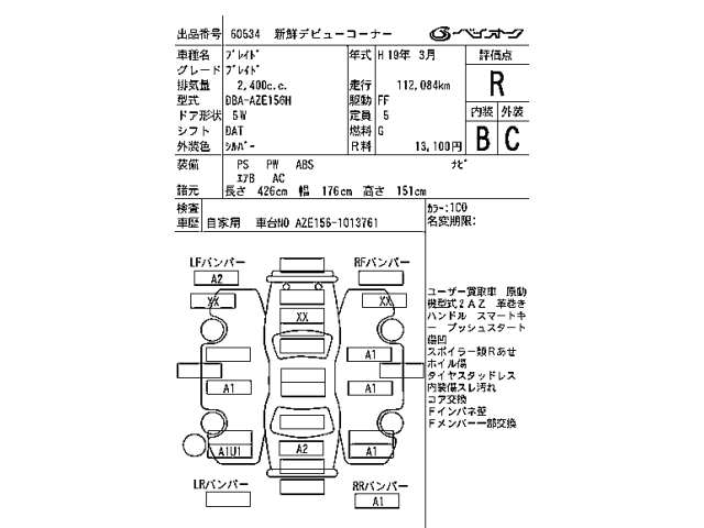 | Chassis # | AZE156-1013761 | Drive | 2WD |